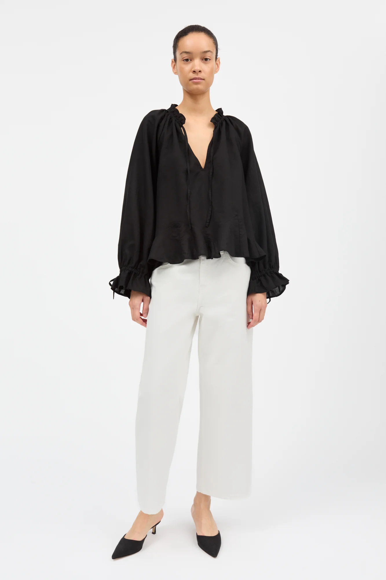 Feminine blouse with ruffles and strings.